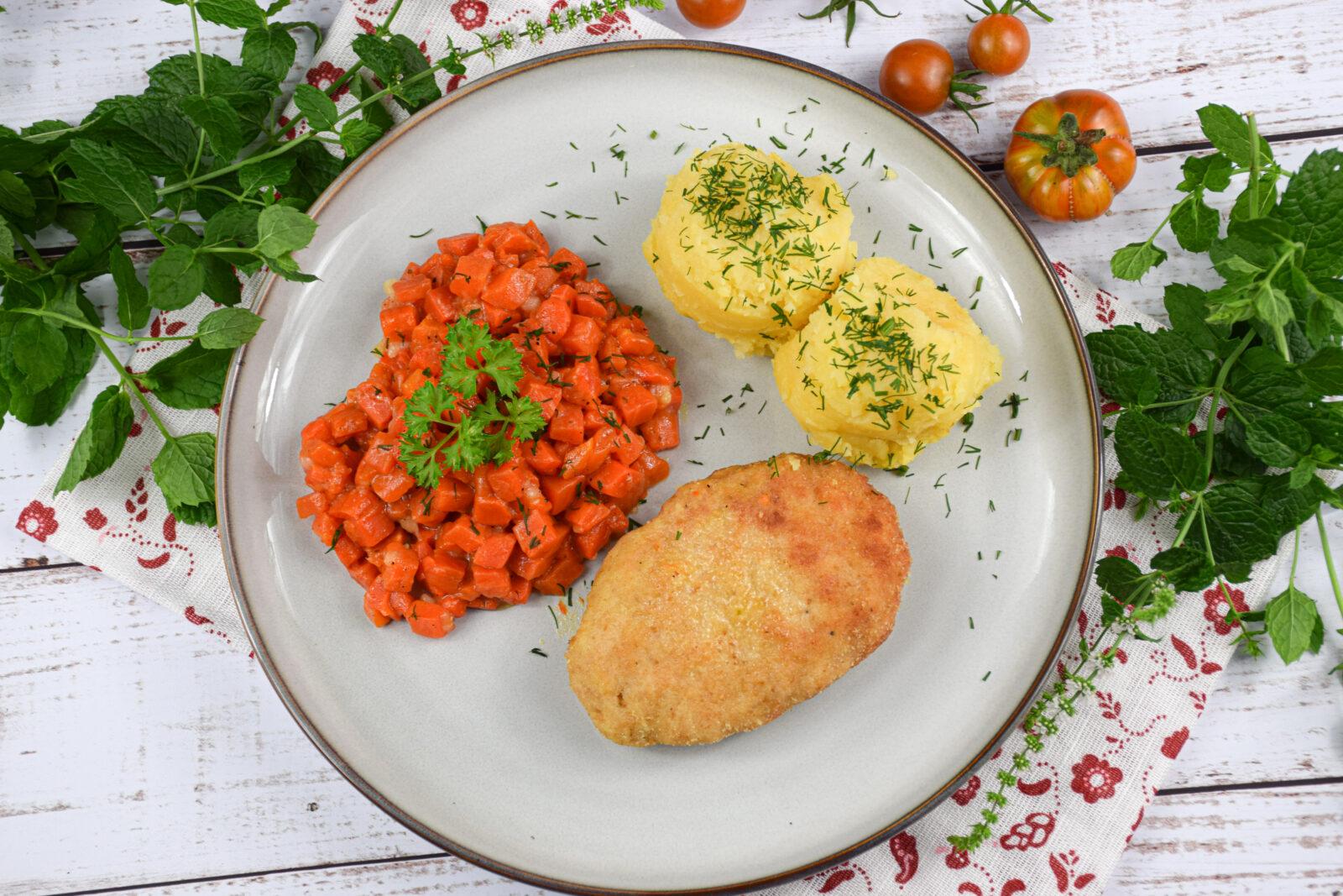 Klasyczny zestaw obiadowy, w którego skład wchodzą ziemniaczki puree, kotlet drobiowy z serem (devolay) oraz gotowana marchewka z groszkiem.
